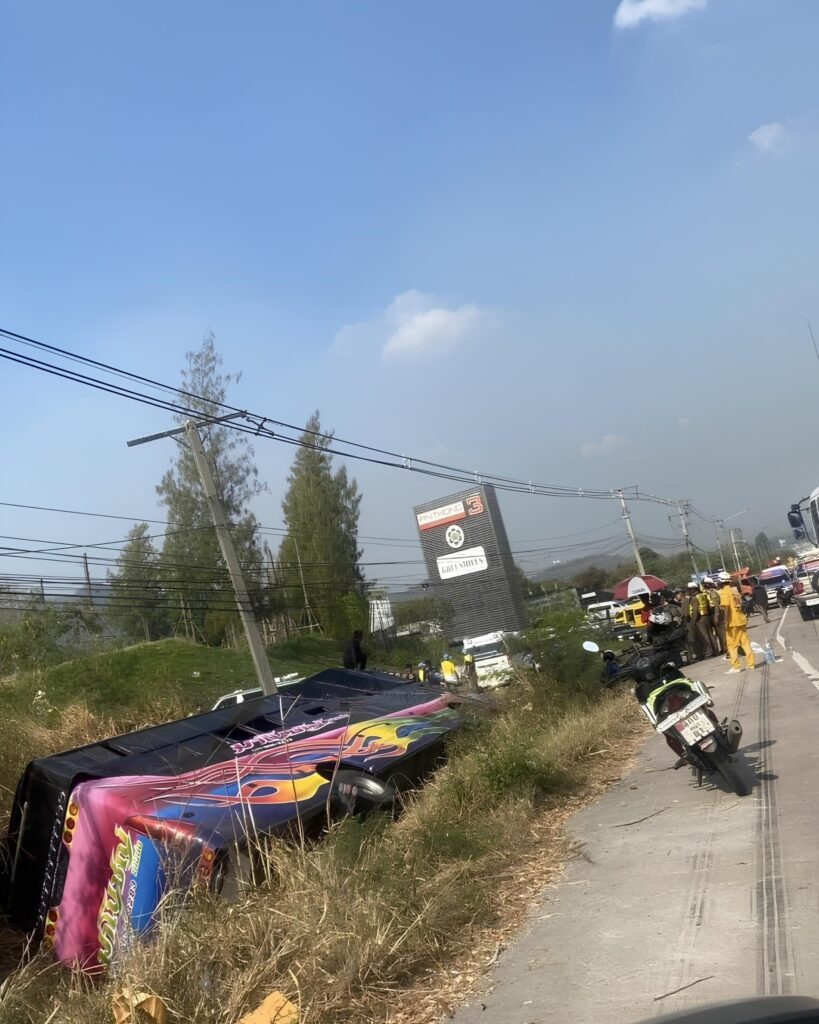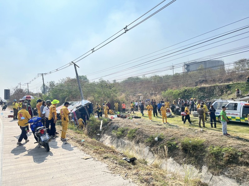 สุดระทึก! รถบัสรับส่งพนักงาน เสียหลักพลิกคว่ำตกข้างทาง บาดเจ็บอื้อกว่า 40 คน