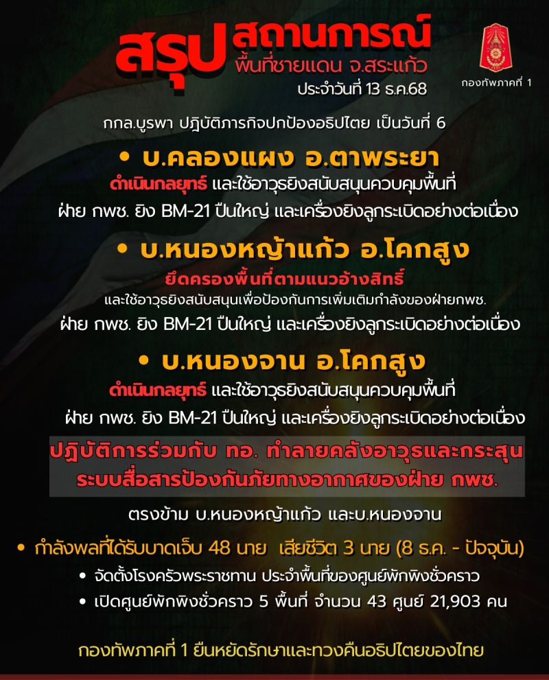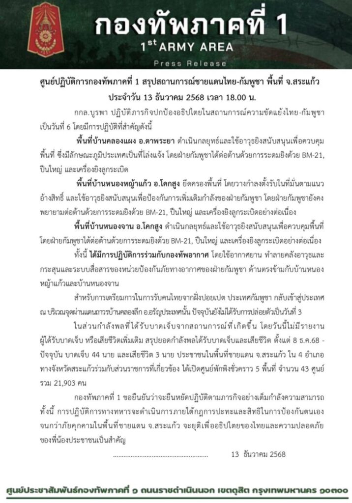 วันที่ 13 ธันวาคม 2568 ศูนย์ปฏิบัติการ กองทัพภาคที่ 1 สรุปสถานการณ์ชายแดนไทย-กัมพูชา พื้นที่ จ.สระแก้ว ประจำวัน 13 ธันวาคม 2568 เวลา 18.00 น.